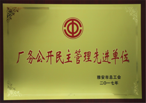 7月13日,市總工會組織召開了雅安市廠務(wù)公開民主管理專題培訓(xùn)會,會上對全市廠務(wù)公開民主管理示范單位先進單位和示范班組進行了表彰,我公司被評為“全市廠務(wù)公開民主管理先進單位”,充分肯定了我公司廠務(wù)公開民主管理工作。