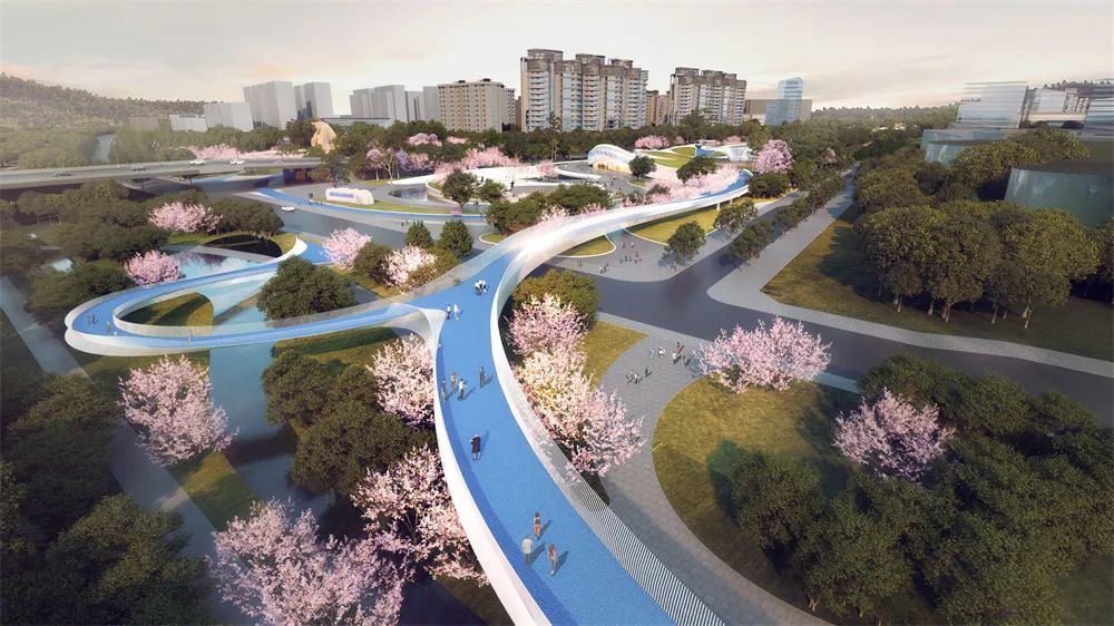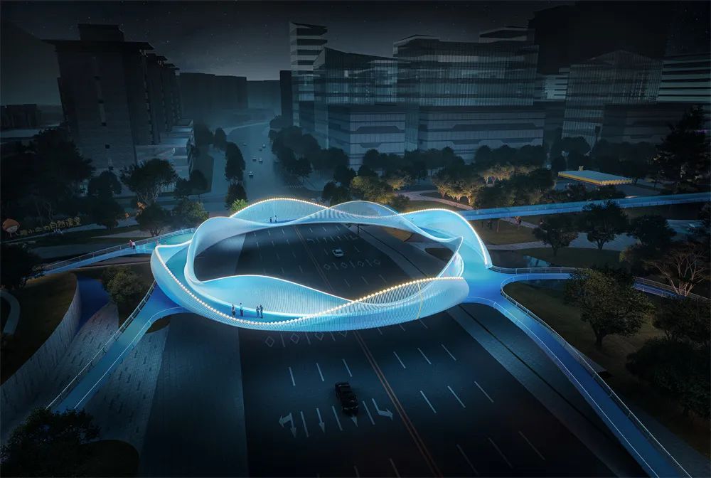 設(shè)計環(huán)形人行天橋,猶如一朵盛開的嬌艷的花,有機聯(lián)系起項目的南北地塊,同時兼顧新區(qū) 大道的人行過街功能,結(jié)合燈光藝術(shù)營造,也將成為該片區(qū)一個標志性的打卡點,象征著雅安因多樣而美麗,因共生而繁盛。基因環(huán)圍欄展示雅安特色物種。地面燈光按植物花色進行分段布置,同時通過投影設(shè)備和交互式燈光等設(shè)施,增加游人體驗感。環(huán)形橋跨越機動車道,基因環(huán)的出現(xiàn)開始了生物密碼的探索之旅。