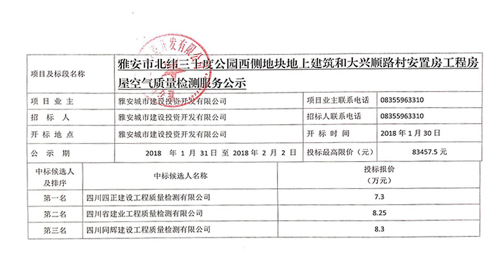 雅安市北緯三十度公園西側(cè)地塊地上建筑工程和大興順路村安置房工程房屋空氣質(zhì)量檢測(cè)服務(wù)公示
