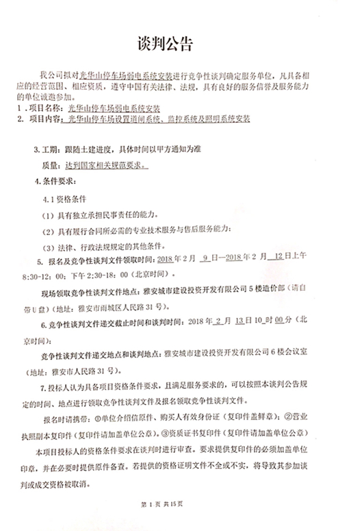 關(guān)于光華山停車場弱電系統(tǒng)安裝進行競爭性談判確定服務(wù)單位的邀請函
