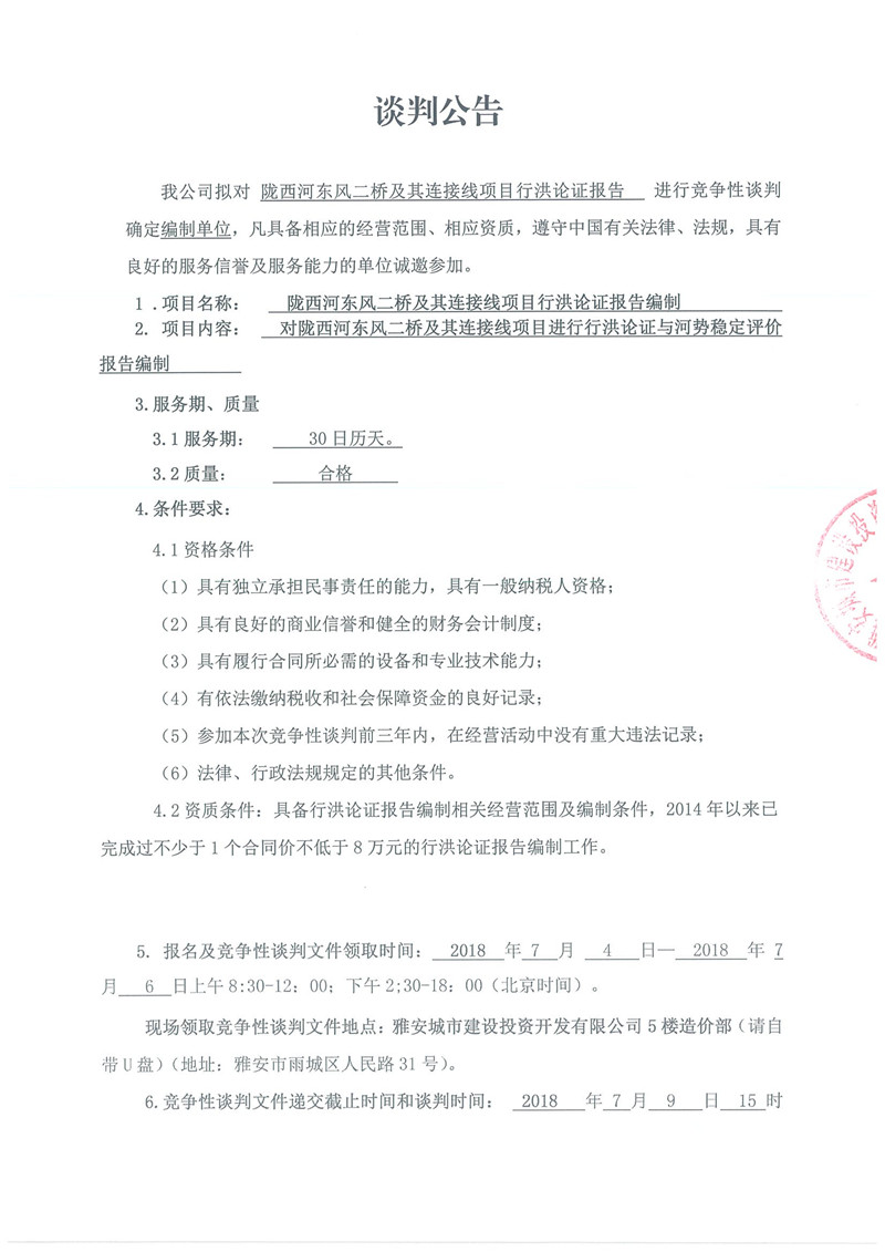 隴西河?xùn)|風(fēng)二橋及其連接線項(xiàng)目行洪論證報(bào)告編制的競(jìng)爭(zhēng)性談判公告