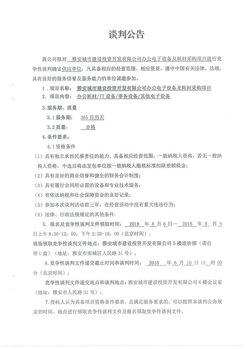 雅安城市建設(shè)投資開發(fā)有限公司辦公電子設(shè)備及耗材采購(gòu)項(xiàng)目——競(jìng)爭(zhēng)性談判公告