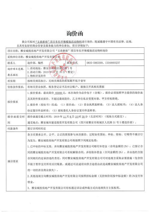 雅安城投房地產(chǎn)開發(fā)有限公司“文曲新座”項(xiàng)目車位開售暖場活動物料詢價(jià)函(第二次)