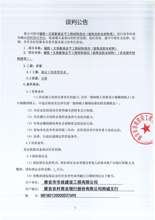 市政公司城投•文曲新座總平工程材料供應(yīng)(裝飾及防水材料)競(jìng)爭(zhēng)性談判公告