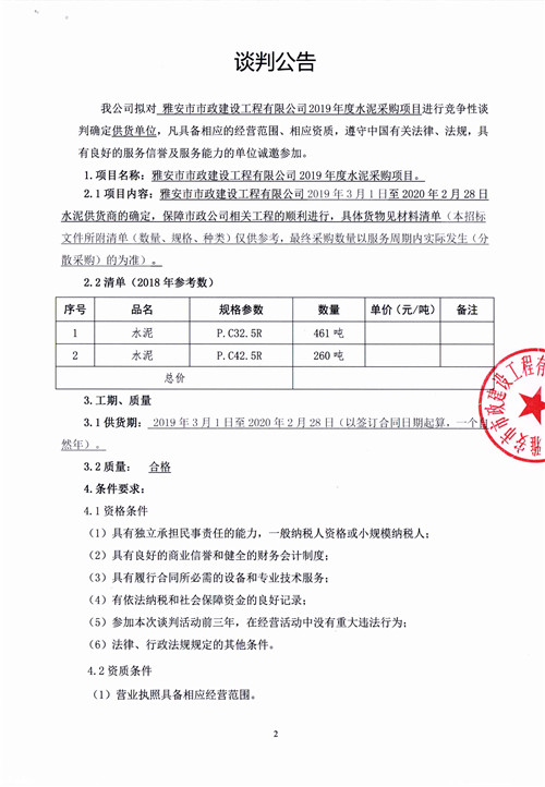 市政公司2019年度水泥采購項目競爭性談判公告