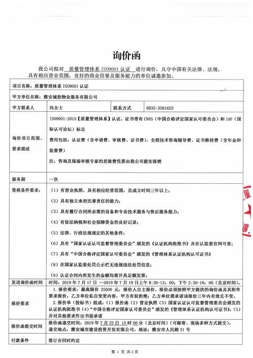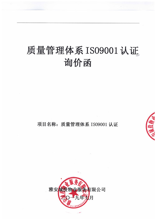 城投物業(yè)質(zhì)量管理體系IS09001認(rèn)證詢價(jià)函