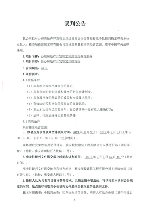 雅安城投建筑工程有限公司辦理房地產(chǎn)開(kāi)發(fā)暫定三級(jí)資質(zhì)咨詢服務(wù)競(jìng)爭(zhēng)性談判公告