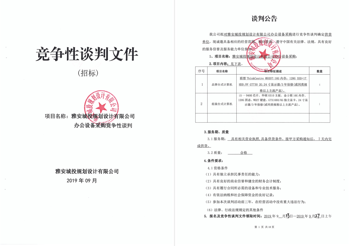 雅安城投規(guī)劃設(shè)計(jì)有限公司辦公設(shè)備采購(gòu)進(jìn)行競(jìng)爭(zhēng)性談判的公告