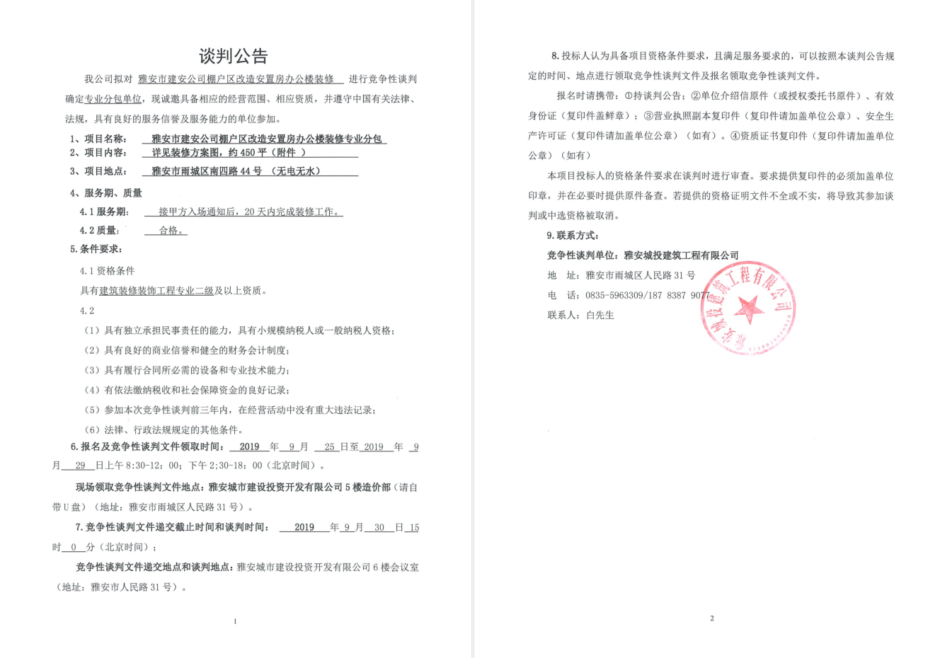 雅安市建安公司棚改區(qū)改造安置房辦公樓裝修競(jìng)爭(zhēng)性談判公告