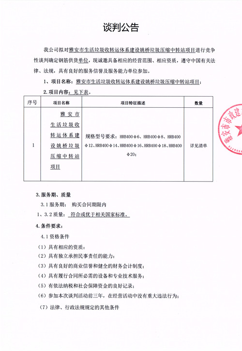 雅安市生活垃圾轉(zhuǎn)運(yùn)體系建設(shè)姚橋垃圾壓縮中轉(zhuǎn)站項(xiàng)目確定鋼筋供貨單位的競(jìng)爭(zhēng)性談判公告