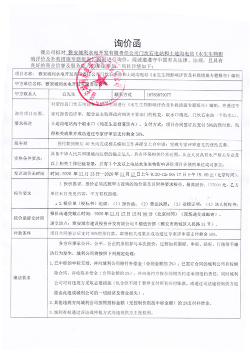 城利水電公司門(mén)坎石電站和土地溝電站《水生生物影響評(píng)價(jià)及補(bǔ)救措施專(zhuān)題報(bào)告》詢價(jià)函