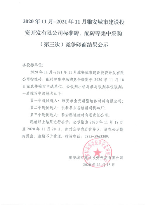 2020年11月-2021年11月雅安城市建設(shè)投資開發(fā)有限公司標(biāo)準磚、配磚等集中采購(第三次)競爭磋商結(jié)果公示