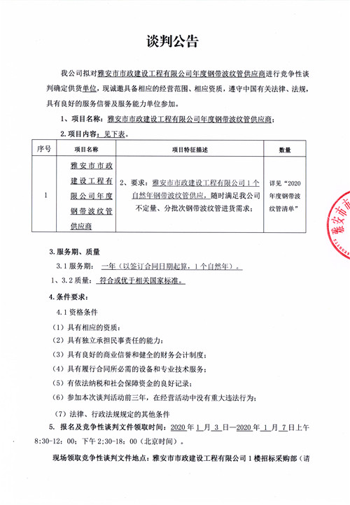 雅安市市政建設(shè)工程有限公司年度鋼帶波紋管供應(yīng)商競(jìng)爭(zhēng)性談判公告