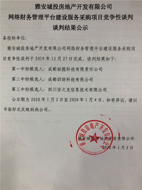 雅安城投房地產(chǎn)開(kāi)發(fā)有限公司網(wǎng)絡(luò)財(cái)務(wù)管理平臺(tái)建設(shè)服務(wù)采購(gòu)項(xiàng)目競(jìng)爭(zhēng)性談判結(jié)果公司