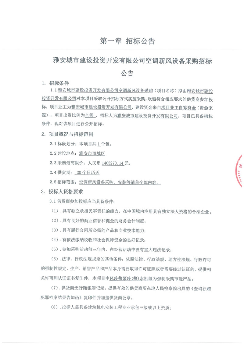 雅安城市建設(shè)投資開發(fā)有限公司空調(diào)新風(fēng)設(shè)備采購(gòu)招標(biāo)公告