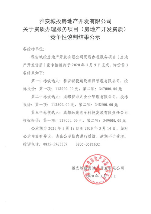 城投地產(chǎn)公司關(guān)于資質(zhì)辦理服務(wù)項(xiàng)目(房地產(chǎn)開發(fā)資質(zhì))競爭性談判結(jié)果公示