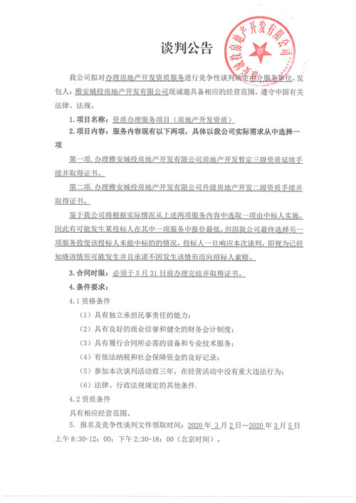 城投地產(chǎn)公司辦理房地產(chǎn)開發(fā)資質(zhì)服務(wù)確認(rèn)中介服務(wù)單位的競爭性談判公告