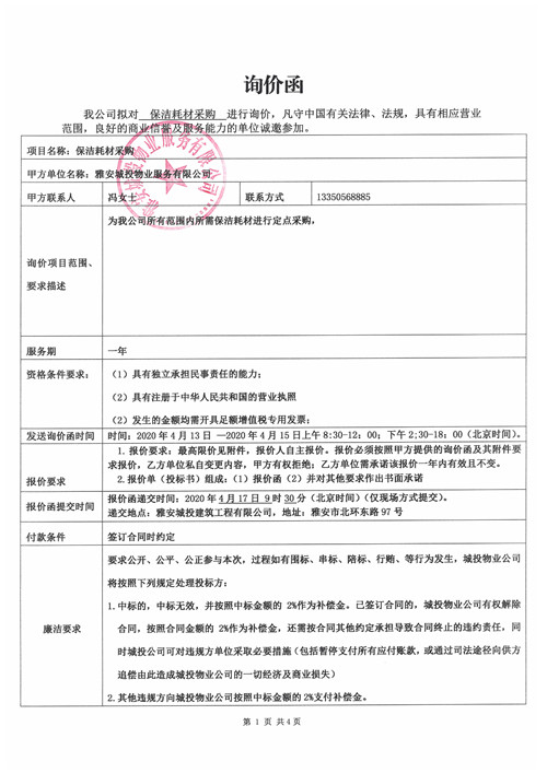 保潔耗材采購詢價函