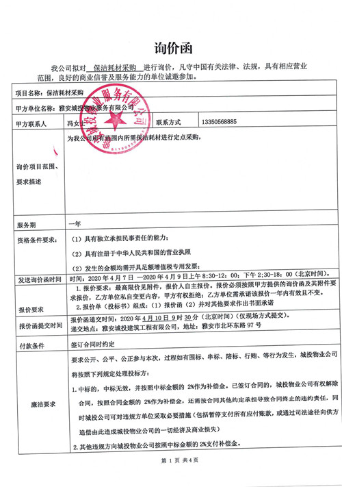 城投物業(yè)公司保潔耗材采購(gòu)詢價(jià)函