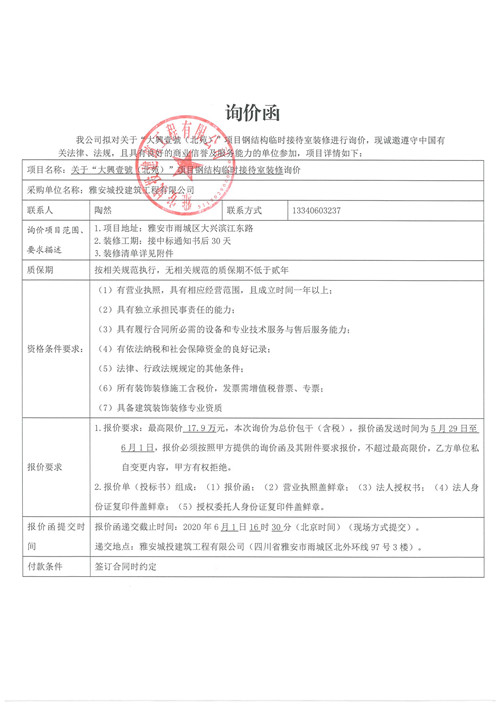 城投建工公司“大興壹號(北苑)”項(xiàng)目鋼結(jié)構(gòu) 臨時接待室裝修的詢價函