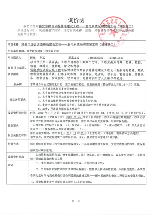 城投建工公司雅安市綜合訓練基地建設工程——弱電系統(tǒng)采購安裝工程詢價函