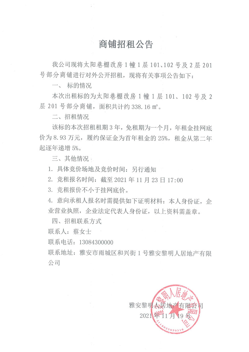 太陽巷棚改房1幢1層101、102號及2層201號部分商鋪招租公告