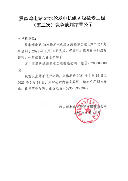 城利水電公司羅家灣電站2#水輪發(fā)電機(jī)組A級(jí)檢修工程(第二次)競(jìng)爭(zhēng)性談判結(jié)果公示
