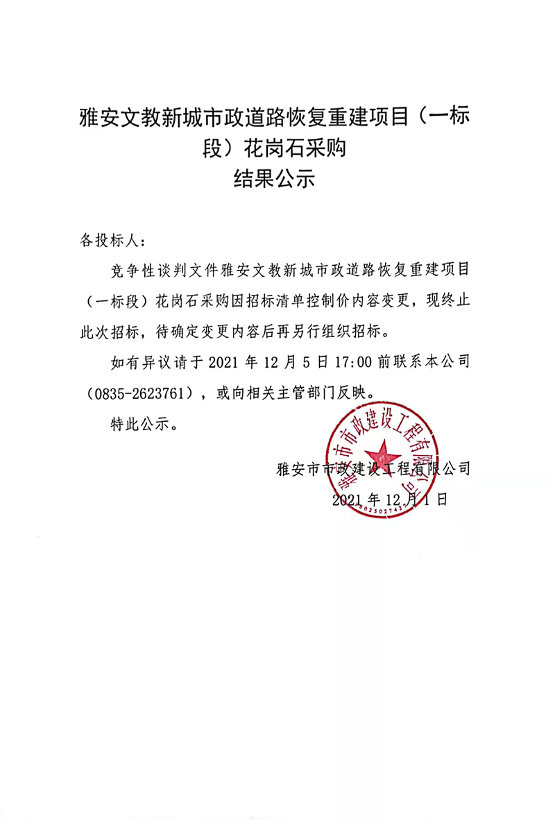 雅安文教新城市政道路恢復(fù)重建項(xiàng)目(一標(biāo)段)花崗石采購(gòu)結(jié)果公示