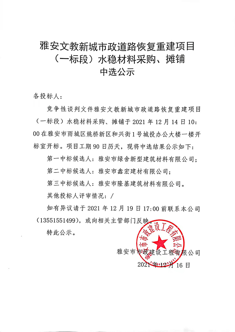 雅安文教新城市政道路恢復(fù)重建項(xiàng)目(一標(biāo)段)水穩(wěn)層材料采購、攤鋪中選公示