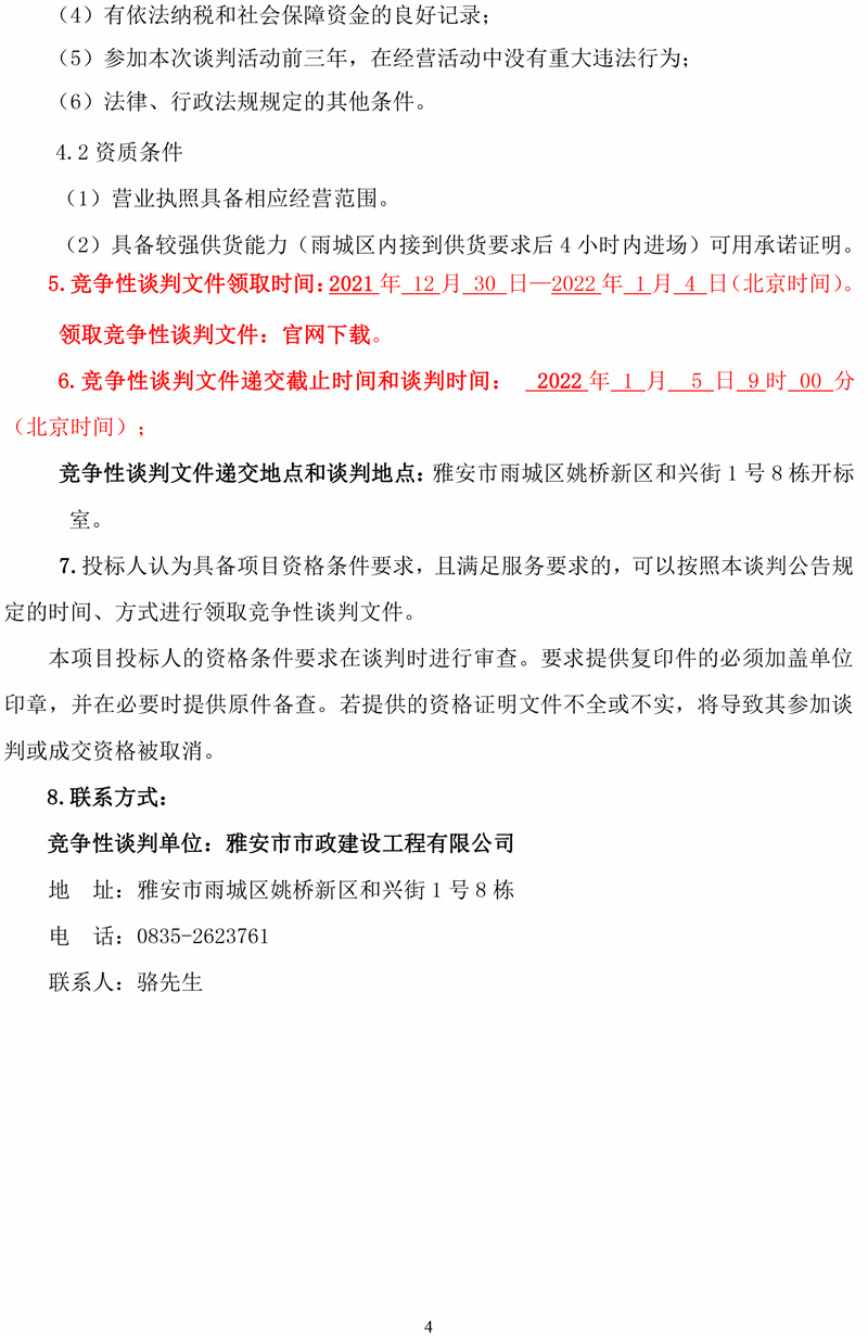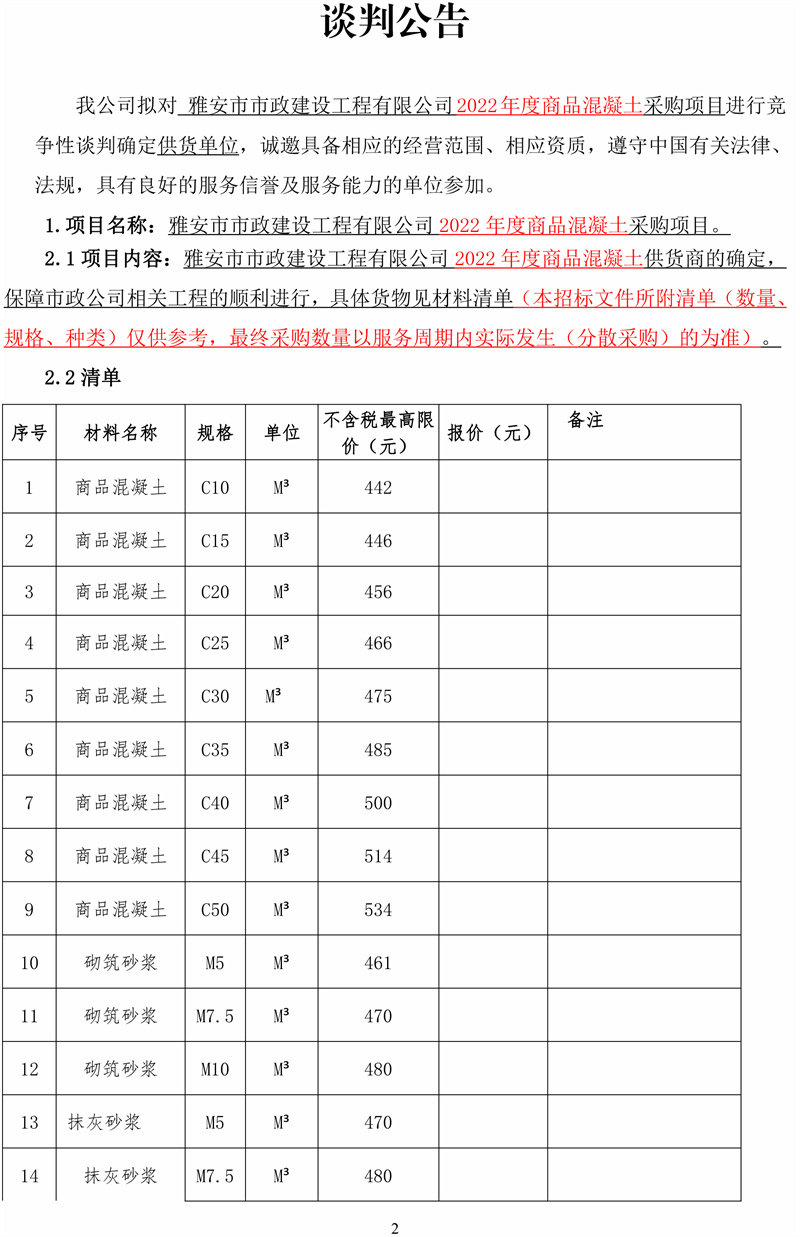 雅安市市政建設(shè)工程有限公司2022年度商品混凝土采購(gòu)項(xiàng)目競(jìng)爭(zhēng)性談判公告