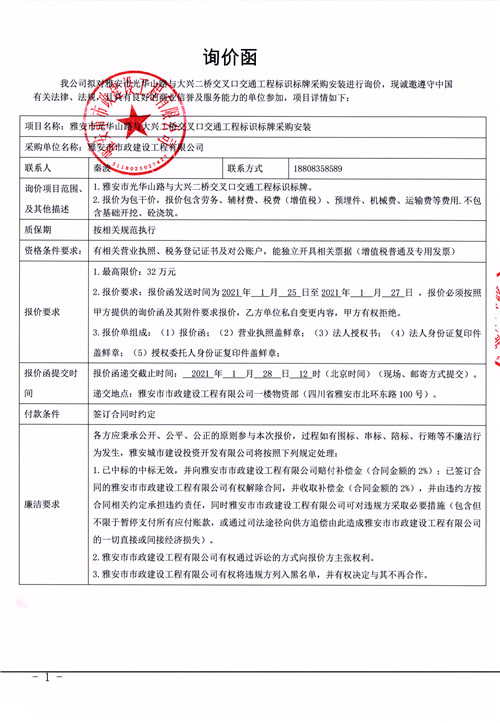 雅安市市政建設(shè)工程有限公司雅安市光華山路與大興二橋交叉口交通工程標(biāo)識(shí)標(biāo)牌采購(gòu)安裝詢(xún)價(jià)函