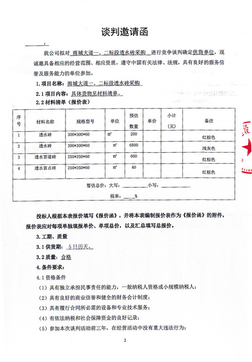 市政公司雨城大道一、二標(biāo)段透水磚采購(gòu)競(jìng)爭(zhēng)性談判公告