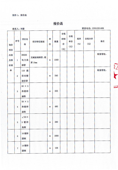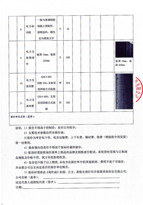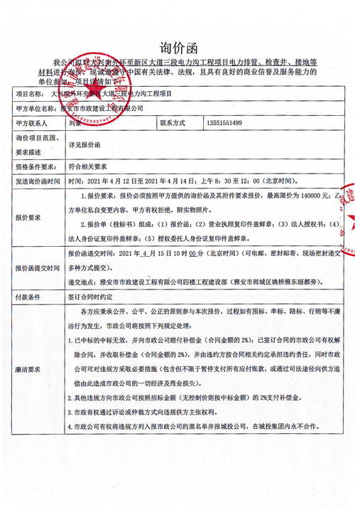 雅安市政公司大興南外環(huán)至新區(qū)大道三段電力溝工程項(xiàng)目電力排管、檢查井、接地等材料詢價(jià)函詢價(jià)