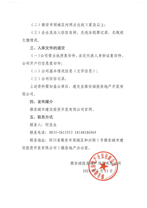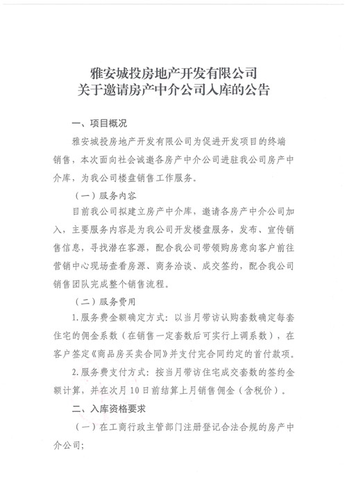 雅安城投房地產(chǎn)開(kāi)發(fā)有限公司關(guān)于邀請(qǐng)房地產(chǎn)中介公司入庫(kù)的公告