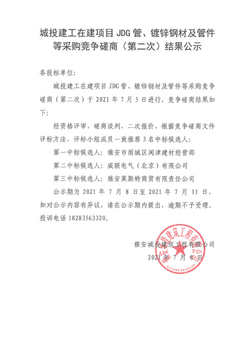 城投建工公司在建項(xiàng)目JDG管、鍍鋅鋼材及管件等采購競爭性磋商(第二次)結(jié)果公示