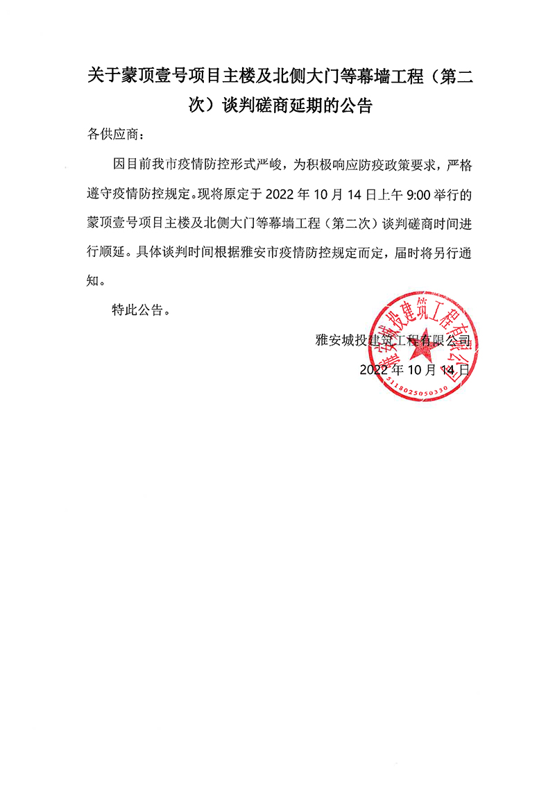 蒙頂壹號項目主樓及北側大門等幕墻工程(第二次)談判磋商延期的公告