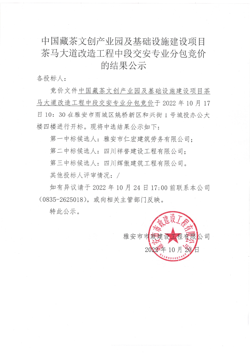 中國藏茶文創(chuàng)產業(yè)園及基礎設施建設項目茶馬大道改造工程中段交安專業(yè)分包競價的結果公示
