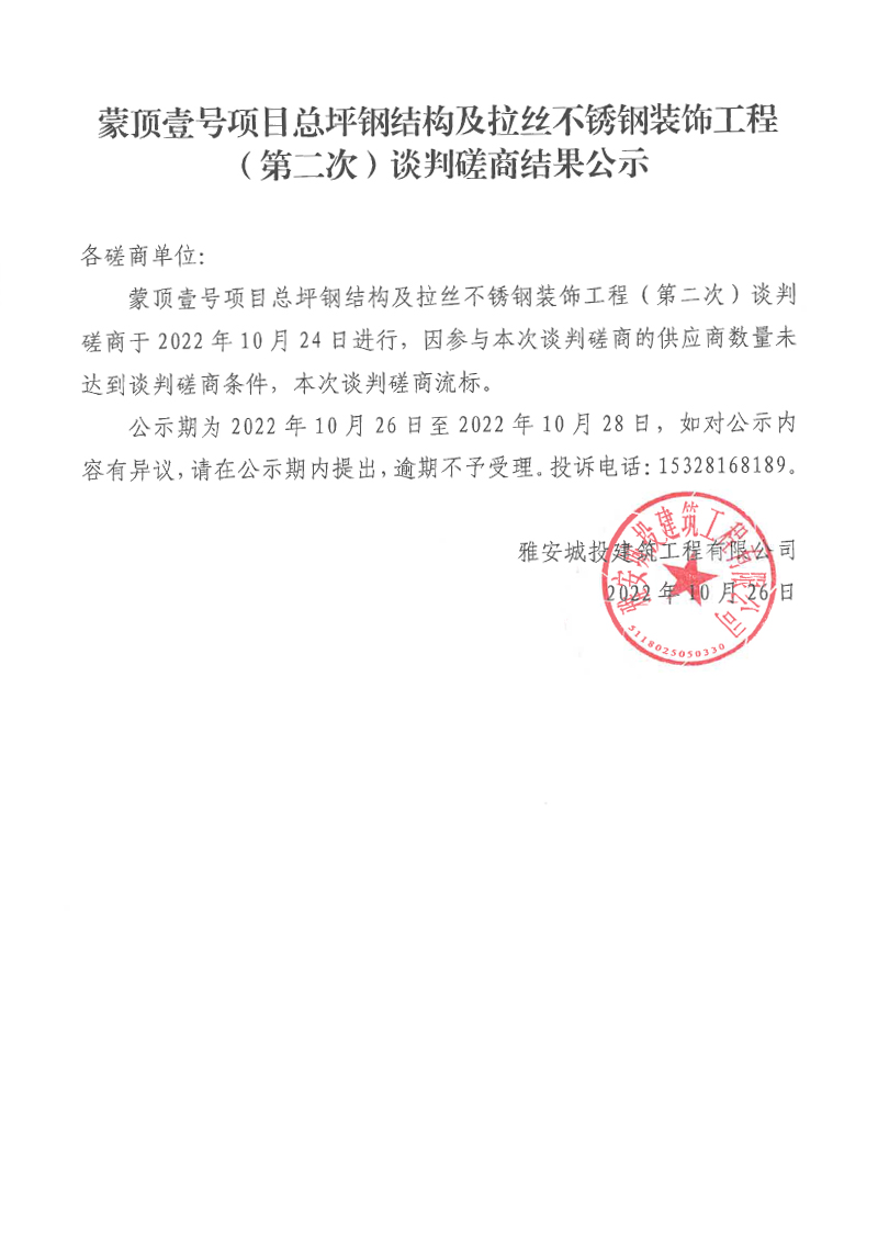 蒙頂壹號項(xiàng)目總坪鋼結(jié)構(gòu)及拉絲不銹鋼裝飾工程(第二次)談判磋商結(jié)果公示