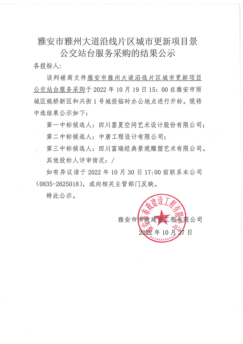 雅安市雅州大道沿線片區(qū)城市更新項(xiàng)目景觀公交站臺(tái)服務(wù)采購的結(jié)果公示