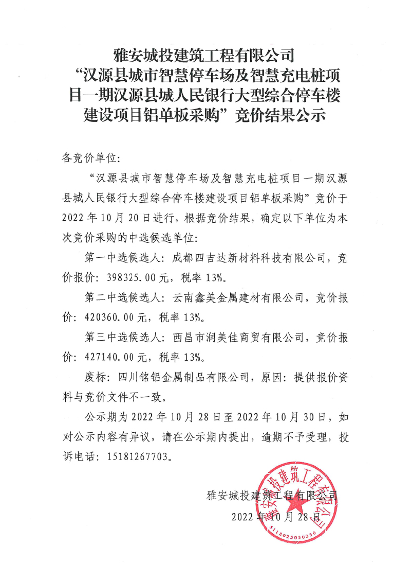 漢源縣城市智慧停車場(chǎng)及智慧充電樁項(xiàng)目一期漢源縣城人民銀行大型綜合樓停車樓建設(shè)項(xiàng)目鋁單板材料采購(gòu)競(jìng)價(jià)結(jié)果公示