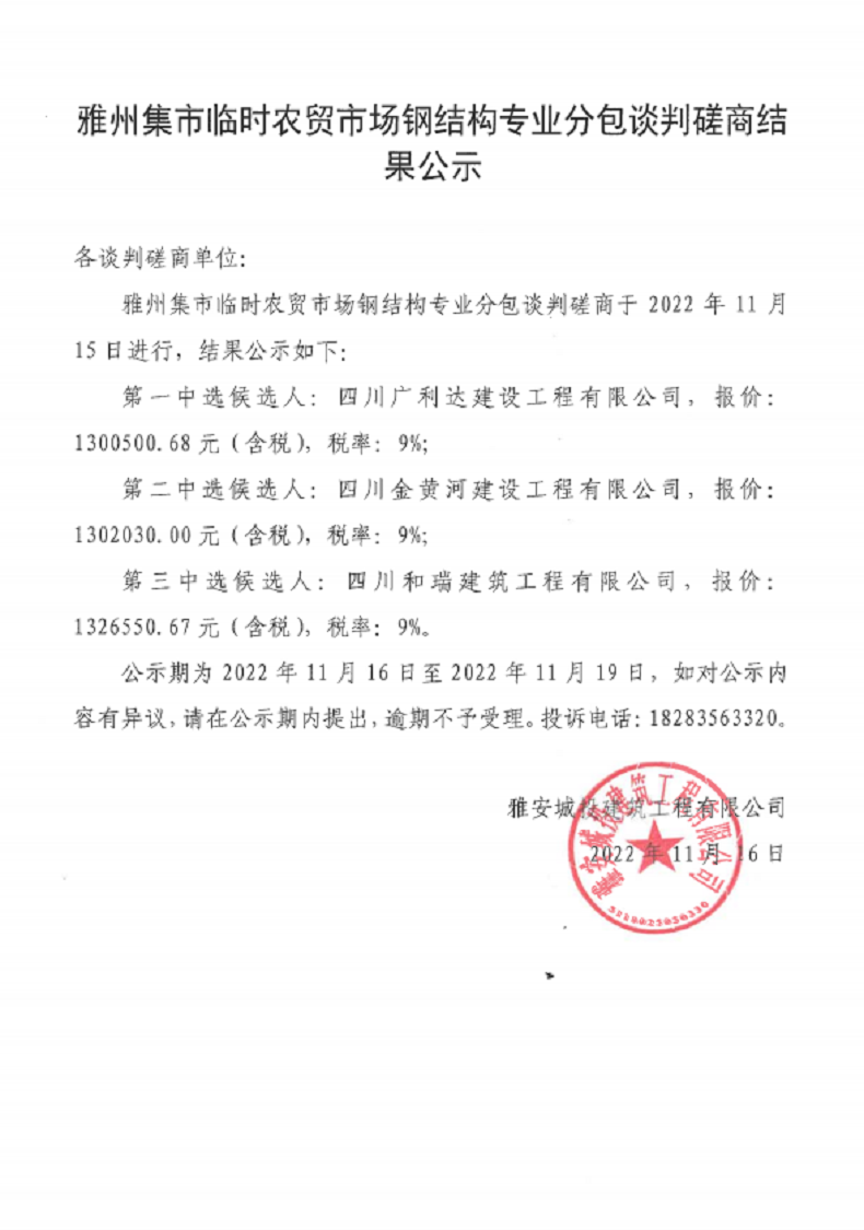 雅州集市臨時(shí)農(nóng)貿(mào)市場(chǎng)鋼結(jié)構(gòu)專(zhuān)業(yè)分包談判磋商結(jié)果公示