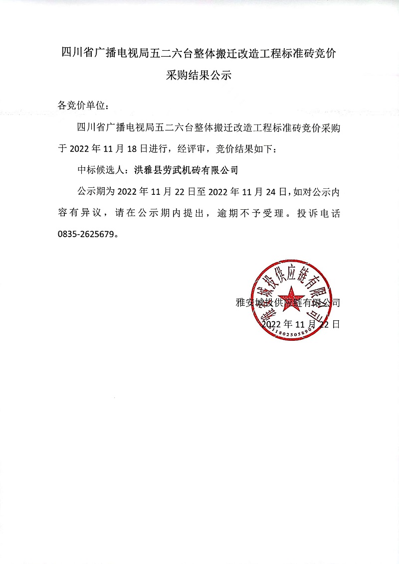 四川省廣播電視局五二六臺(tái)整體搬遷改造工程標(biāo)準(zhǔn)磚競價(jià)采購結(jié)果公示