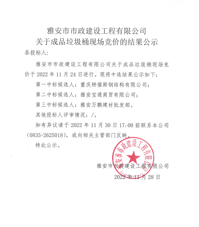 雅安市市政建設(shè)工程有限公司關(guān)于成品垃圾桶現(xiàn)場競價的結(jié)果公示