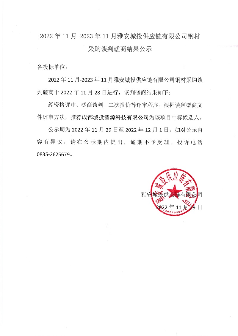 2022年11月-2023年11月雅安城投供應鏈有限公司鋼材采購談判磋商結(jié)果公示