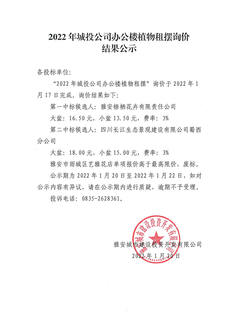 2022年城投公司辦公樓植物租擺詢價結果公示