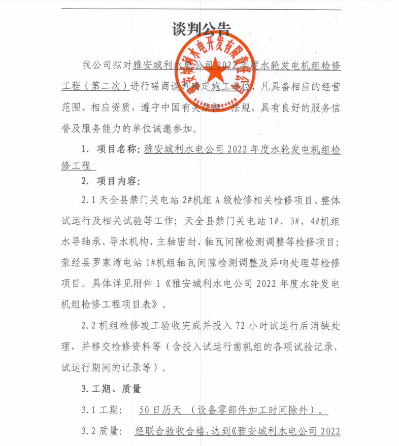 雅安城利水電公司2022年度水輪發(fā)電機組檢修工程(第二次)磋商談判公告
