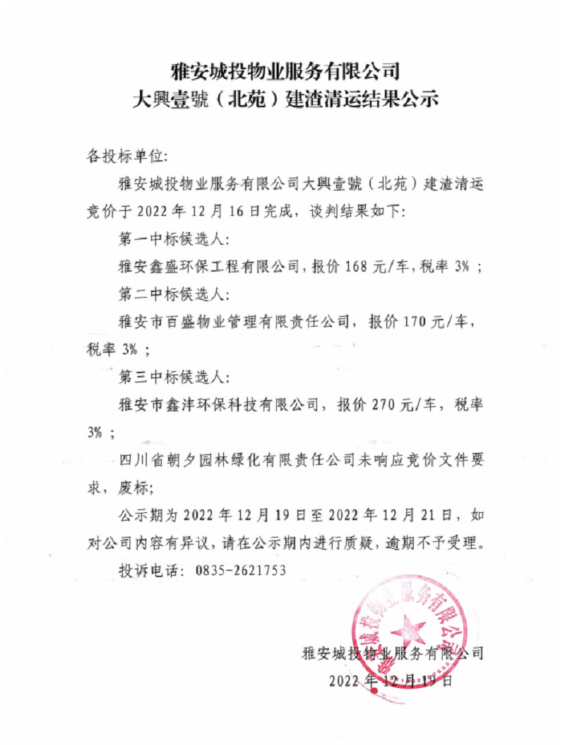 雅安城投物業(yè)服務(wù)有限公司大興壹號(hào)(北苑)建渣清運(yùn)結(jié)果公示