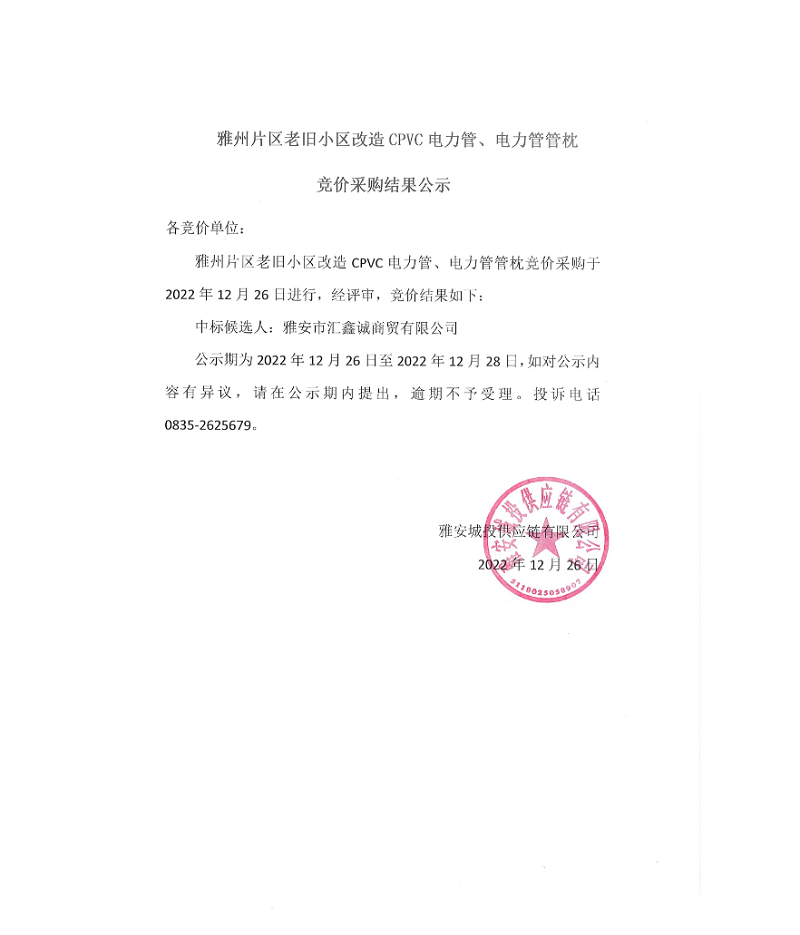 雅州片區(qū)老舊小區(qū)改造CPVC電力管、電力管管枕競價采購結(jié)果公示
