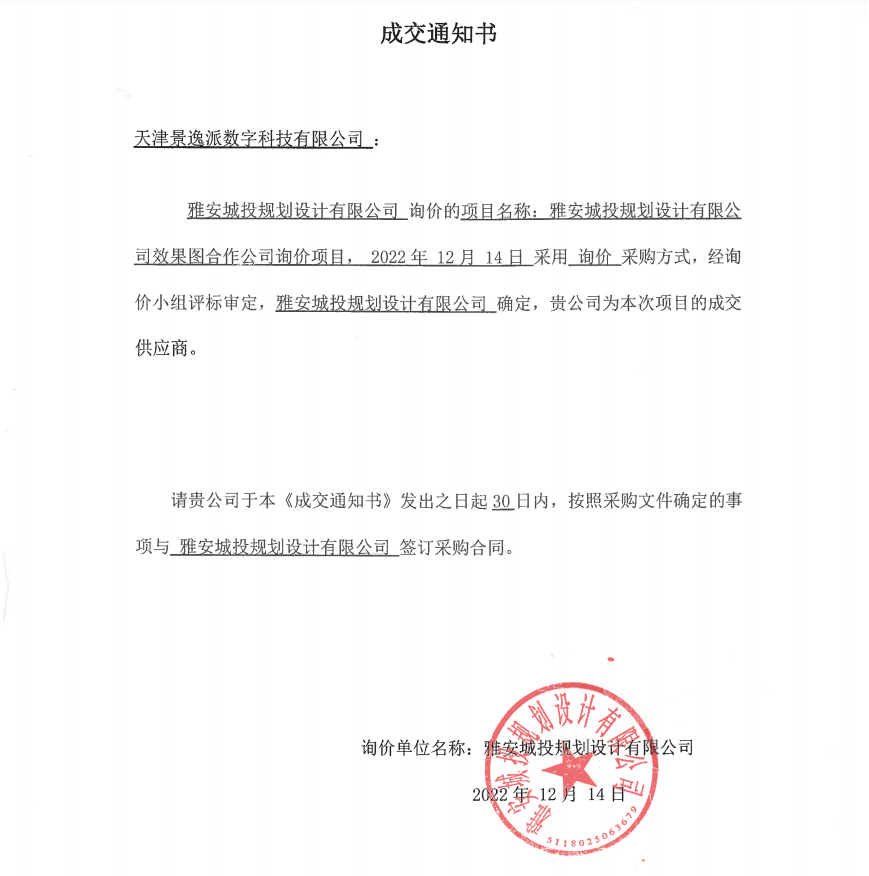 雅安城投規(guī)劃設(shè)計(jì)有限公司效果圖詢價(jià)成交通知書(shū)