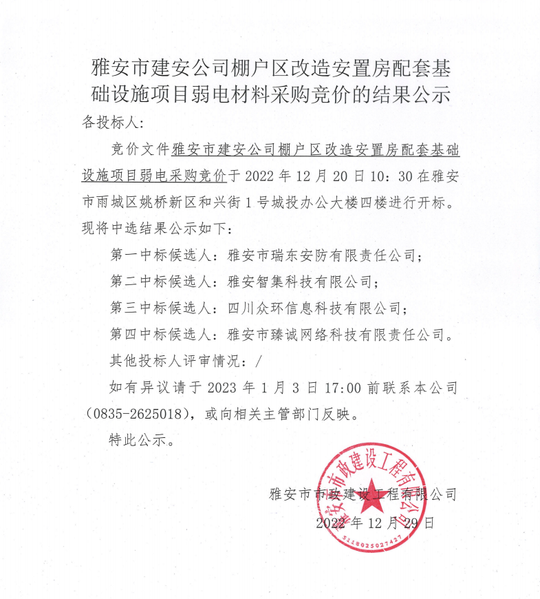 雅安市建安公司棚戶區(qū)改造安置房配套基礎設施項目弱電材料采購競價結(jié)果公示